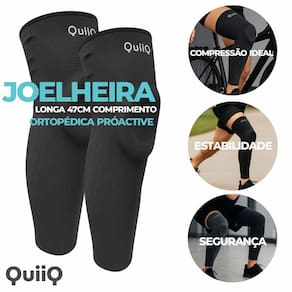 Joelheira Caneleira Longa PróActive QuiiQ com 47cm de comprimento. Oferecendo máxima compressão, estabilidade e conforto com sua dupla haste flexível de aço leve e anel de silicone patelar.