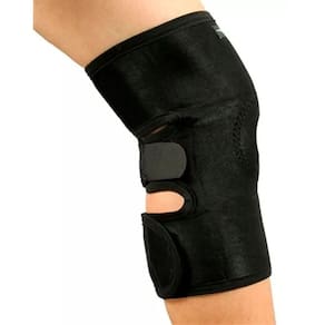 Tem fechos aderentes que ajustam a compressão conforme a sua necessidade, retém o calor devido ao material em neoprene, auxilia no alívio da dor.