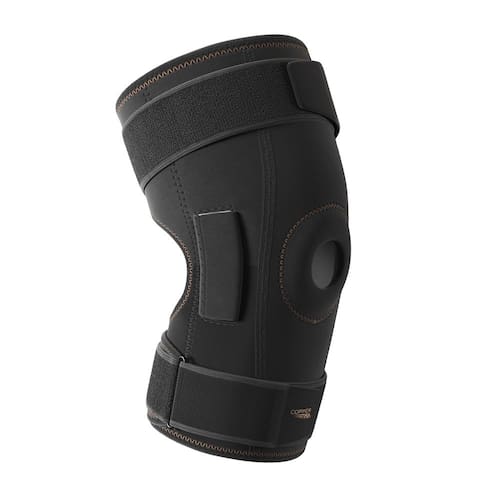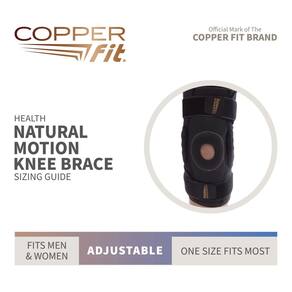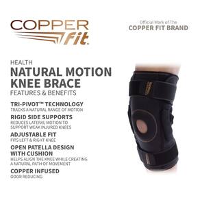 - Copper Fit A joelheira Natural Motion possui uma dobradiça rígida patenteada X-PIVOT projetada para fornecer suporte lateral forte do joelho e um movimento de flexão mais confortável e natural para conforto durante todo o dia.