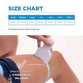 - Dica de tamanho fácil: sem fita métrica de tecido? Sem problemas! Basta enrolar uma corda ao redor da perna 12,7 cm acima da patela, marcar o comprimento e compará-la com uma régua para encontrar o ajuste perfeito usando nosso guia de tamanhos.