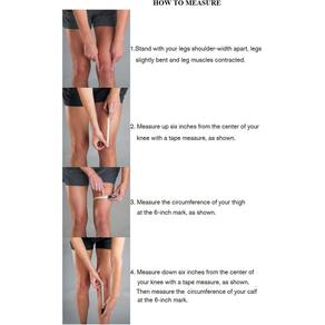 — Dica adequada: meça sua coxa e panturrilha 6 polegadas acima e abaixo da rótula usando uma fita métrica flexível. Use o diâmetro que você mede aqui para escolher seu tamanho