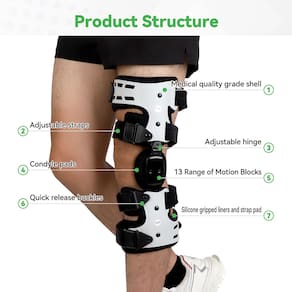 - Suporte de joelho de reabilitação superior para reduzir a dor no joelho e inflamação do joelho: a joelheira OA ajuda a reduzir a dor em pacientes que sofrem de artrite reumatóide, osteoartrite unicompartimental leve a grave do joelho, dor óssea no joelho. A joelheira também ajuda a apoiar o desarranjo da cartilagem meniscal, reparo de defeitos da cartilagem articular e necrose avascular ou recuperação de fratura do platô tibial e reparo da cartilagem do joelho.