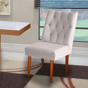 Ela é fabricada em madeira de eucalipto refrorestavel,com tecido suede com pés palitos super reforçada . e com um lindo detalhe em seu encosto com um lindo trabalho de capitonê artesanal,e botão encapados. essa cadeira sem sombra de duvidas além de ser linda é super confortavel.