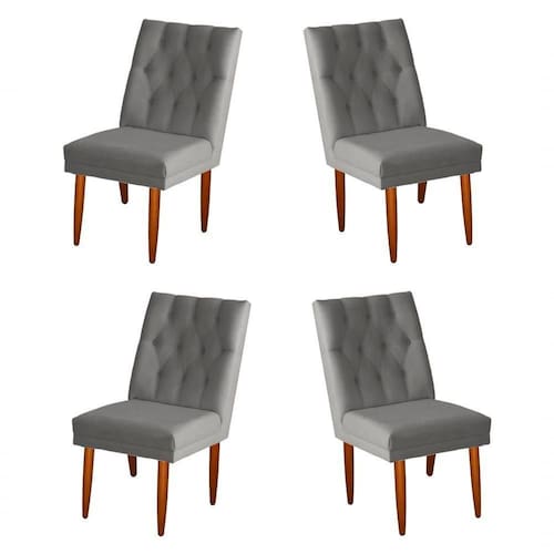 Ela é fabricada em madeira de eucalipto refrorestavel,com tecido suede com pés palitos super reforçada . e com um lindo detalhe em seu encosto com um lindo trabalho de capitonê artesanal,e botão encapados. essa cadeira sem sombra de duvidas além de ser linda é super confortavel.