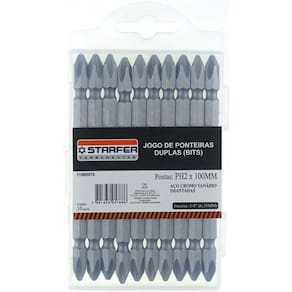 este aço é utilizado para gerar uma resistência melhor para as ferramentas; para ou doméstico; utilizado em parafusadeiras para apertar ou soltar parafusos. - medida da ponta phillips 2 - encaixe = 1/4" 6,35mm - comprimento = 100mm. Embalagem: caixa plástica com 10 peças. Ref. :11065570 marca: starfer