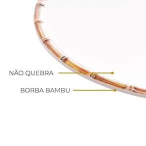 A parte central branca do prato cria um fundo neutro e elegante, enquanto a borda de bambu adiciona um toque de rusticidade e charme. Essa combinação de materiais e texturas cria um equilíbrio harmonioso entre o moderno e o natural, tornando o prato perfeito para uma variedade de ocasiões.