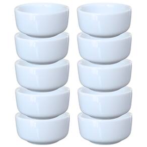 Jogo 10 tigelas 60ml Bowls Tigelas Kit Porcelana branca(2)Peças de porcelana feitas de material de alta qualidade, queimados em alta temperatura, o que as torna fortes, resistentes e com alto brilho, e deixa qualquer ambiente mais bonito e moderno. Podem ir ao Forno, Micro-ondas e Lava-louçasServem molhos, caldas, petiscos, cereais, sobremesas, etc. Ótimas para se ter em casa, e também para restaurantes, buffets, lanchonetes, etc. A porcelana tem uma enorme vantagem sobre outros materiais, pois é fácil de limpar e não absorve cheiro, o que deixa a peça e o ambiente livre de mal cheiro. Cor Branca, Capacidade 60ml OBS: Peças de porcelana Legitima de 2ª linha. "Contêm pequenas marcas que não afetam na utilização do produto.Pode haver variação de tonalidade entre as peças devido a diferentes lotes de queima. Embalagem contêm 10 peças Marca: Antilope Decor Porcelanas