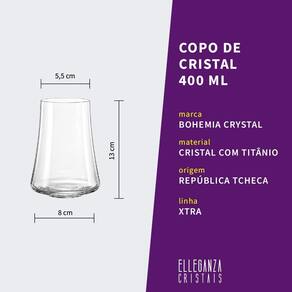 Jogo com 12 copos de cristal para água e whisky linha xtra bohemia Jogo com 12 copos de cristal para água e whisky da linha xtra bohemia crystal Resistência titânio e cristal ecológico Detalhes do produto Material: cristal com titânio, mais resistente que o cristal comum Origem: produto da república tcheca Produto: copos de cristal Quantidade: 12 copos, sendo: 06 copos longos para água; 06 copos para whisky. Capacidade: 06 copos longos para água com 400 ml cada copo; 06 copos para whisky com 350 ml cada copo. Tamanho: Água: 13 cm de altura, 5,5 cm de diâmetro de bocal e 8 cm de diâmetro de base Whisky: 10 cm de altura, 6 cm de diâmetro de bocal e 8 cm de diâmetro de base Marca: bohemia crystal Linha: xtra Embalagem: os produtos são cuidadosamente envolvidos por plástico bolha e entregues na caixa do fabricante, inserida em outra caixa reforçada para assegurar a integridade do produto no transporte. Substituímos produtos danificados no transporte. Postamos nossos produtos nos correios de 01 a 02 após a compra. Todos os nossos produtos acompanham a impressa. Trocas e devoluções Seguimos todas as normas vigentes no código de defesa do consumidor. Adicionalmente, trocamos produtos danificados no transporte. Informações relevantes 1. Já imaginou beber ou servir suas bebidas em taças ou copos de cristal com classe e sofisticação A elleganza cristais comercializa produtos com preços excepcionalmente abaixo do mercado, de qualidade assegurada pela marca tcheca bohemia crystal. Após anos de pesquisa e desenvolvimento, distribui em mais de 100 países cristal de espessura bem fina, livre de Cinza, com design e transparência incríveis. 2. Mas cristal não quebra facilmente Não. O cristal com titânio é muito mais resistente a impactos e mudanças de temperatura se comparado ao cristal comum, proporcionando maior segurança e comodidade no manuseio. A elleganza cristais trabalha apenas com produtos contendo titânio em sua composição, trazendo excelência e qualidade a preços imbatíveis. Sobre a bohemia crystal A bohemia crystal é líder global no mercado de cristais, com atuação em mais de 100 países. Fabrica seus produtos na república tcheca e realiza altos investimentos no desenvolvimento e melhoramento de seus produtos para garantir-lhes qualidade de ponta e ser referência global de qualidade e sofisticação. Eles foram os precursores do movimento que tornou o cristal um material ecológico, sem Cinza em sua composição. Também se destacam de outras marcas ao adicionar titânio para seus produtos mais especiais e assegurar resistência muito superior ao cristal comum. A marca oferece aos seus clientes uma vasta gama de produtos, desde utensílios domésticos a itens para indústria química. Cada linha de produto tem sua embalagem personalizada de acordo com suas características e tamanho. Marca: Não Informado