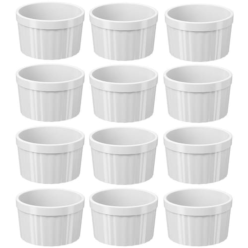 Garantia: 90 dias / Peso: 432g / Cor predominante: branco / Referência: 7896553956160X12 Dimensões de cada ramekin: 7,9cm (D) x 4,7cm (A); Capacidade (cada): 150ml; Conteúdo: 12 ramekins; Material: polipropileno (PP).