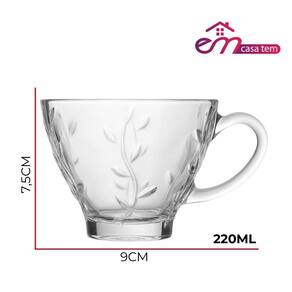 A xícara de chá de vidro da marca Em Casa Tem combina elegância e funcionalidade em um design delicado com capacidade para 220ml. Produzida em vidro transparente de alta qualidade, ela apresenta um acabamento texturizado com relevo em forma de ramos e folhas, oferecendo um toque decorativo e sofisticado à peça sem comprometer sua leveza visual.