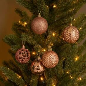 Transforme sua árvore em um verdadeiro espetáculo de elegância com este jogo de 18 bolas natalinas rosê metalizado, com design exclusivo em textura folha palmeira e glitter vazado. Cada peça foi desenvolvida para trazer luxo, brilho e sofisticação à sua decoração natalina.