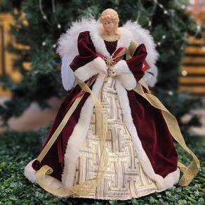 -01 Unidade Anjo Decorativo Ponteira de Árvore de Natal Luxo 40cm, Roupa em Veludo Vinho e Dourado