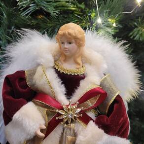 Design Luxuoso: O anjo veste uma roupa de veludo nas cores vinho e dourado, cuidadosamente decorada para refletir a riqueza e a beleza da temporada natalina.
