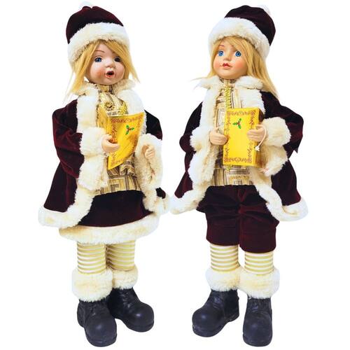 Bonecos Coral Natalino Decorativo Menino e Menina 42cm – Musical à Corda com Paletó em Veludo Luxo Vinho e Creme, Rosto em Resina com Movimento Suave