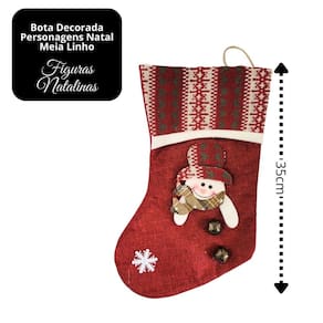 Jogo 2 Botas Decorativa Meia Natalina Papai Noel e Boneco de Neve – Linho Vinho 35cm com Guizos
