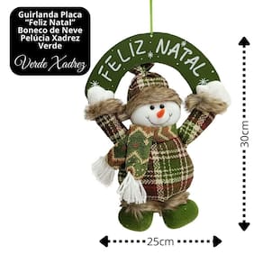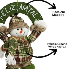 1 Guirlanda com Boneco de Neve em pelúcia verde xadrez com cachecol e gorro estilo crochê.