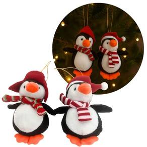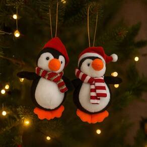 Deixe sua árvore de Natal ainda mais encantadora com este jogo de 2 pinguins decorativos em pelúcia prime, cuidadosamente confeccionados para adicionar um toque divertido e aconchegante à sua decoração natalina. Cada pinguim é decorado com gorrinho e cachecol em tons vermelhos festivos, realçando o contraste elegante entre as cores preto, branco e laranja.