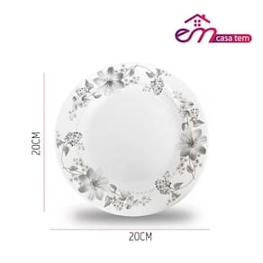 Prato de Sobremesa Vidro Branco Flores Cinza Flowers Grey 20cm Em Casa Tem