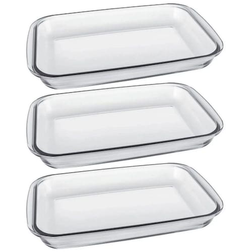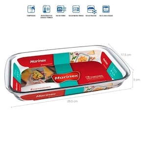 Forma Assadeira De Vidro Borossilicato Retangular 1,6l Travessa Refratária Pequena Marinex. #Linha Nadir Figueiredo Marinex #Assadeira retangular pequena #Resiste a choque térmico Garantia: 90 dias / Peso: 964Kg / Cor: Transparente / Ref: GD16532011NX3 Dimensões de cada: 29,5cm (C) x 17,5cm (L) x 5cm (A) Dimensões Internas de cada forma: 25cm (C) x 16cm (L) x 4,5cm (A) Formato: Retangulares. Capacidade de cada: 1,6 Litros. Conteúdo: 03 Assadeiras Retangulares Pequenas. Limpeza e cuidados: - Lavar com água e sabão neutro utilizando esponja macia, seguido de pano seco; - Não utilizar produtos químicos ou abrasivos na limpeza; - Vai a lava-louças. Detalhes do produto: - A capacidade volumétrica máxima para cozimento é de 3/4 da capacidade total da peça; - Não utilizar diretamente sobre a chama, aquecedor elétrico, chapa ou grelha; - Possui pegadores que facilitam o manuseio entre o forno e a mesa; - Pode ser levado ao forno com temperatura máxima de +300°C; - Pode ser levado ao freezer com temperatura mínima de -20°C; - Suporta choque térmico de até 180°C; - Produto livre de BPA. Material: - Vidro Borossilicato: Alta resistência ao calor e a impactos. Não pega cheiro e não mancha. Atóxico, pode entrar em contato com alimentos. Do forno à mesa, este conjunto de três formas assadeiras retangulares 1,6 litros Marinex é elegante e funcional. Fabricadas em vidro borossilicato, estas travessas refratárias preservam o sabor natural dos alimentos e conservam a comida aquecida por mais tempo. De alta qualidade e resistência, suportam choques térmicos e favorecem a praticidade no dia-a-dia. O design elegante das peças tem bordas arredondadas e pegas laterais para maior conforto no manuseio.