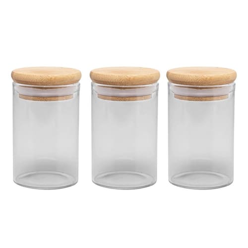 Kit 3 Potes Hermético Porta Mantimento Vidro Tampa Bambu 90ml