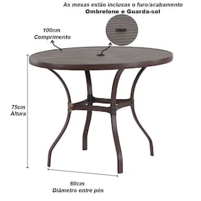 - Mesa Roma 100cm Diâmetro com Furo Central Acabamento da Estrutura: Pintura Altura do assento até o chão: 40 cm Ambiente Principal: Jardim e Varanda Apoio para Braços Estofado: Não codigo_ean: 7900288255907 Cor: Argila Cor do Produto: Argila Escala de Brilho: Fosco Estrutura do Assento: Alumínio Estrutura do Encosto: Alumínio Giratória: Não Itens Inclusos: 4 Cadeira e 1 Mesa Linha ou Coleção: Emily Marca: Trama Moveis Material da Base: Alumínio Necessita Montagem: Não Origem do Produto: Nacional Peso: 15 kg Possui Apoio Para os Pés: Não Possui Rodízio: Não Recomendações de Uso, Manutenção e Limpeza: A cadeira Emily foi desenvolvida para uso em áreas externas, podendo ficar exposta ao sol e à chuva sem comprometer sua funcionalidade. Utilize-a sempre em superfícies planas para maior estabilidade e evite pular, se jogar ou realizar movimentos bruscos sobre o produto. Respeite o limite de peso indicado pelo fabricante e, ao movimentá-la, não arraste sobre pisos ásperos para não danificar a estrutura.A limpeza deve ser feita com pano macio levemente umedecido em água para retirar poeira e sujeiras leves. Para manchas mais resistentes, utilize sabão neutro diluído em água, aplicando sempre com pano macio. Não use produtos abrasivos, cloro, solventes, esponjas de aço ou escovas de cerdas duras, pois podem comprometer o acabamento do produto. Resistente à Chuva: Sim Revestimento do Assento: Fibra Sintética Revestimento do Encosto: Fibra Sintética Suporta Até (kg): 170 kg Tipo de Assento: Fixo Tipo de Encosto: Fixo Marca: Não Informado
