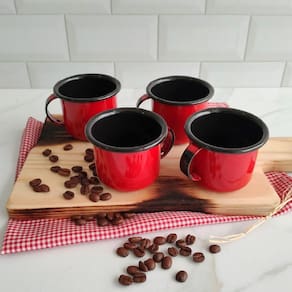Jogo 4 Canecas Esmaltadas Retrô 90ml Xícaras Ágata Para Café Chá. #Linha artesanal Esmaltados Silva #Conjunto de canecas ágata retrô #Xícaras esmaltadas N°6 Garantia: 90 Dias / Peso: 318g / Cores: Vermelho ou preto / Ref: 2272E2271X4 Dimensões: 8,5cm (C) x 7cm (L) x 5,5cm (A) Dimensões internas: 6cm (D) x 5cm (A) Capacidade: 90ml Conteúdo: 04 Xícaras. Limpeza e cuidados: - Lavar com água e sabão neutro utilizando esponja macia, seguido de pano seco; - Não utilizar produtos químicos ou abrasivos na limpeza; - Evitar batidas e contato com objetos cortantes; - Vão a lava-louças. Detalhes do produto: - Atóxicas, não liberam resíduos de metais tóxicos nos alimentos, contribuindo para uma vida mais saudável; - Pequenos pontos nas peças não são considerados defeitos, e sim características do processo produtivo; - Com a alta capacidade de retenção de calor, mantém sua bebida quente por muito mais tempo; - Possuem revestimento interno e externo com dupla camada de esmalte; - Possuem alças para segurá-las. Materiais: - Esmalte vítreo; - Aço carbono. Este jogo de quatro xícaras de ágata 90ml da Esmaltados Silva é excelente para seu dia a dia, na hora do chá, cafezinho ou leite. Desenvolvidas em aço carbono e revestidas interna e externamente com dupla camada de esmalte vítreo de alta durabilidade, as canecas esmaltadas possuem design retrô regional e lembram as louças usadas antigamente, especialmente nas casas de avós.