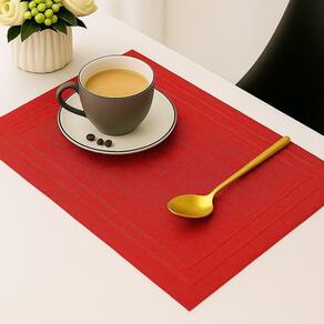A textura em PVC confere aderência, reduzindo o risco de deslizamento de utensílios durante as refeições. A coloração vermelha, combinada ao design retangular, proporciona um toque visual na composição da mesa, adequando-se a diferentes estilos de decoração. Sua manutenção se resume à limpeza com um pano úmido, dispensando a necessidade de lavagem e facilitando a rotina.