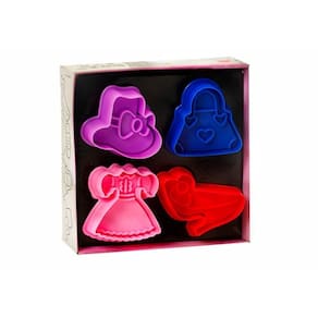 Contém: 1 molde em forma de vestido, 1 de bolsa, 1 de sapato e 1 em forma de chapéu