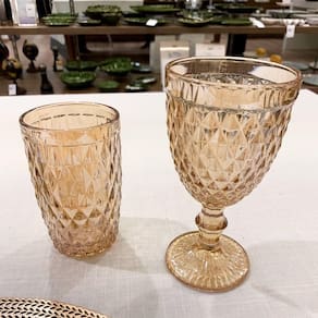 A Taça de Vidro Bico Abacaxi, da Lyor, em um encantador tom de âmbar metalizado é uma adição sofisticada e versátil para sua coleção de utensílios de mesa, perfeita para servir água, vinho e outras bebidas com estilo distinto.