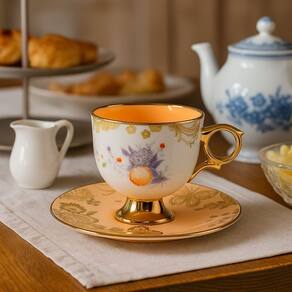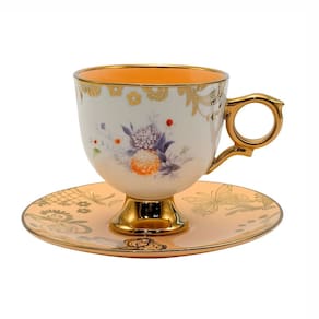 - Cor: Branco e laranja - Material: Porcelana - 4 Xícaras: Altura: 9 x Diâmetro: cm - 4 Pires: Ø14x2cm - Capacidade 200ml Marca: Não Informado