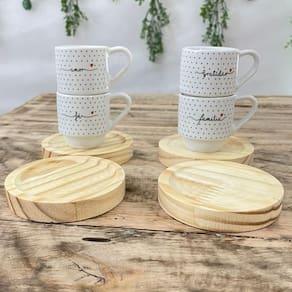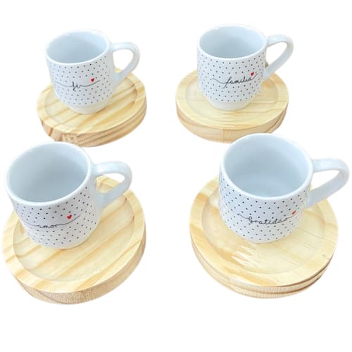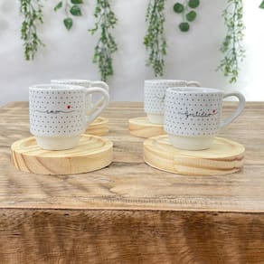Jogo 4 xícaras Café c/ pires redondo - Frases Motivacionais - 80 ml Empilháveis - Poá Preto Peças de porcelana feitas de material de alta qualidade, queimados em alta temperatura, o que os torna fortes, resistentes e com alto brilho, e deixa qualquer ambiente mais bonito e moderno.A porcelana tem uma enorme vantagem sobre outros materiais, pois é fácil de limpar e não absorve cheiro, o que deixa a peça e o ambiente livre de mal cheiro. Os desenhos são decalque aplicados e queimados junto à peça, o que os funde a peça, dão brilho e não desbotam com o tempo. Frases: Amor, Fé, Paz, Felicidade, Gratidão, Família.Forte resistente, podem ir ao micro-ondas.Ótimas para servir café com leite, Chá, água, refrigerante e bebidas em geral.São empilháveis, o que torna o armazenamento mais prático. OBS: Por se tratar de madeira de pinus natural, entre os pires podem existir pequenas variações na tonalidade das cores da madeiraPode haver variação de tonalidade entre as peças devido a diferentes lotes de queima. As palavras a serem enviadas na compra são aleatórias conforme disponibilidade no momento. Embalagem contêm 8 (4 xícaras e 4 pires) Marca: Antilope Decor Porcelanas