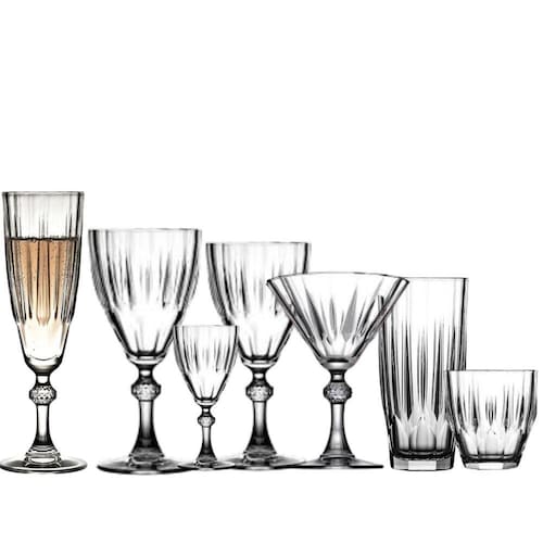 Composição: 6 Taças para Champanhe com 170ml , 6 Taças para Agua com 300ml, 6 Taças para Vinho com 245ml, 6 Taças para Licor com 52ml, 6 Copos para Agua com 315ml