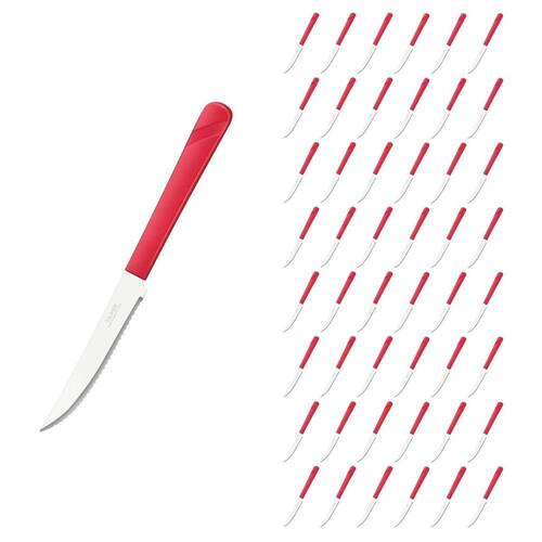 Conjunto de Facas As facas de mesa da linha Luna são um conjunto elegante e funcional para qualquer mesa de jantar. Com um cabo vermelho vibrante feito de plástico de alta qualidade, estas facas são confortáveis de segurar e fáceis de identificar em meio a outros utensílios de mesa. O aço inox de alta qualidade das lâminas garante que elas permaneçam afiadas por um longo tempo, enquanto o design elegante torna as facas uma adição atraente à sua coleção de utensílios de cozinha.