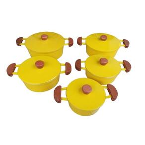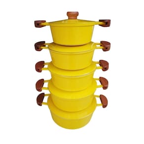 Mais luxo e requinte para sua cozinha, jogo com 5 peças de alumínio fundido com tampa pesada na linda cor Amarela, são 3 camadas de tinta e verniz para maior brilho e durabilidade.