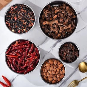 Jogo de potes fabricados em aço inox refinado e com tampa flexível. Possui cinco peças funcionais e versáteis, cada uma com um tamanho e capacidade diferentes.