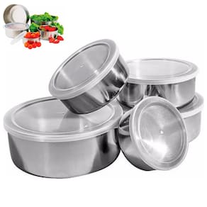 Jogo 5 Potes Inox com Tampa Marmita Conjunto Vasilha Empilhavel Refeiçao Alimento Organizaçao Armazenamento