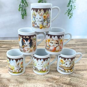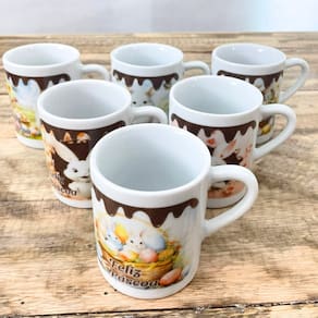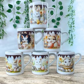 Jogo 6 canecas 120ml - Páscoa - Kit Porcelana Contém 6 canecas com design bem interessante, você pode presentear as pessoas que você gosta.Forte resistente, pode ir ao micro-ondas.Ótimas para servir café com leite, água e bebidas em geral.Decalques com queima e fixação em alta temperatura, o que dá um brilho e charme há qualquer ambiente e não desbotam com o tempo. OBS: Embalagem contem 6 unidades Os coelhos a serem enviadas na compra seguem de acordo com a disponibilidade no momento. Marca: Antilope Decor Porcelanas