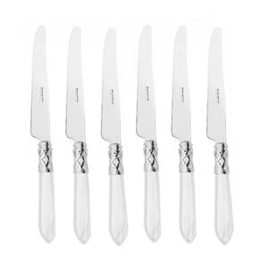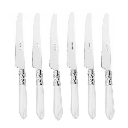 O jogo de 6 facas de mesa da Linha Aladim Shining Ring da Bugatti apresenta um elegante cabo de acrílico combinado com um refinado anel trançado com acabamento em aço polido.