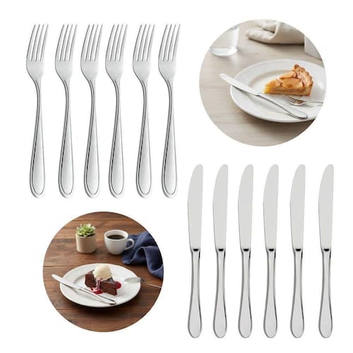 Composto por seis garfos e seis facas de sobremesa, este conjunto é fabricado em aço inoxidável, material que oferece resistência à corrosão e facilita a higienização, mantendo a superfície sem alterações mesmo após uso frequente. Cada garfo possui 17 cm de comprimento, dimensão adequada para o manuseio de porções menores de sobremesas, proporcionando equilíbrio e firmeza durante o uso.