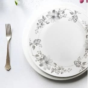A peça pode ser utilizada no dia a dia ou em ocasiões especiais, adicionando um toque de elegância à mesa poO prato de sobremesa Flowers Grey, da Em Casa Tem, possui 20 cm de diâmetro e é confeccionado em vidro branco com estampa floral em cinzasta.