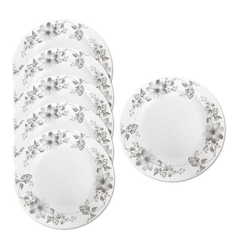 Jogo 6 Prato Raso de Vidro Branco Flores Cinza Flowers Grey 26cm Em Casa Tem