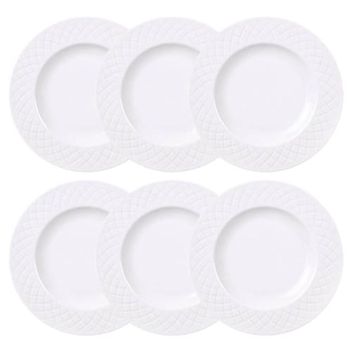 Garantia: 90 dias / Peso unitário: 339g / Cor predominante: branco / Ref.: 7794464835454; Dimensões: 21cm (D) x 2,1cm (A); Conteúdo: 6 pratos para sobremesa; Material: porcelana.