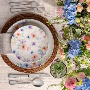 O conjunto faz parte da linha Floratta da Tramontina, caracterizada por uma decoração floral vibrante e atemporal, com detalhes em baixo-relevo que trazem textura e sofisticação à mesa. Os pratos são fabricados em porcelana tradicional de alta qualidade, com porosidade próxima de zero, o que ajuda a evitar a proliferação de fungos e bactérias. Este conjunto é ideal para compor uma mesa com visual refinado e acolhedor. A combinação de flores delicadas e relevo sutil em porcelana faz com que os pratos sejam versáteis, adequados tanto para refeições formais quanto para ocasiões mais descontraídas.
