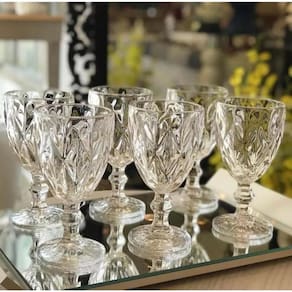 Jogo 6 Taças de Vidro Diamond Vinho Suco Agua 300ml Cor: Clear Transparente Jogo 6 Taças de Vidro Diamond Clear Vinho Suco Água 300ml Ideal para todos os tipos de bebidas, design diamantado será sucesso em suas festas e eventos