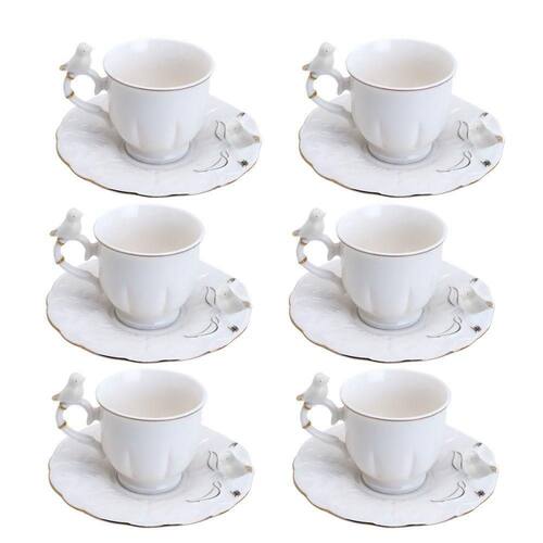 Jogo 6 Xícara de Café Porcelana Birds Branca Fio Dourado Pássaro com Pires 100ml Wolff