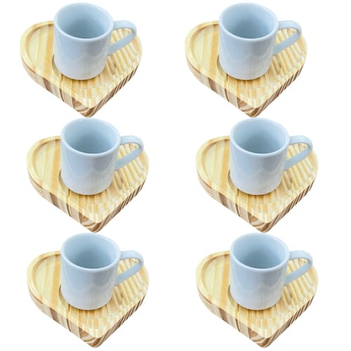 Jogo 6 xícaras café 80ml semi-empilháveis com pires coração - Porcelana branca Peças de porcelana feitas de material de alta qualidade, queimados em alta temperatura, o que os torna fortes, resistentes e com alto brilho, e deixa qualquer ambiente mais bonito e moderno. Nova tendência, mistura de porcelana com madeira, charmosa e moderna para servir em xícaras para todos de sua casa e receber as visitas e amigos. A porcelana tem uma enorme vantagem sobre outros materiais, pois é fácil de limpar e não absorve cheiro, o que deixa a peça e o ambiente livre de mal cheiro. São resistentes ao forno e micro-ondas. Cor Branca Capacidade 80ml OBS: Por se tratar de madeira de pinus natural, entre os pires podem existir pequenas variações na tonalidade das cores da madeira. Pode haver variação de tonalidade entre as peças de porcelana devido a diferentes lotes de queima. Embalagem contêm 6 peças (6 xícaras e 6 pires) Marca: Antilope Decor Porcelanas