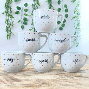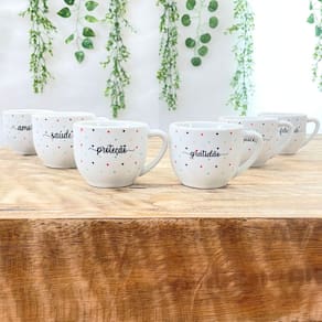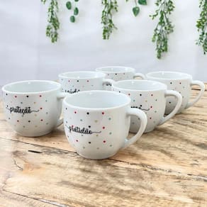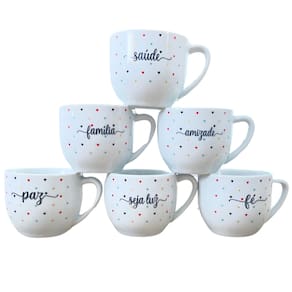 Jogo 6 Xicaras Café/Chá Cônica 170ml - Poá Colorido - Kit Porcelana Branca Contém 6 canecas com design bem interessante, você pode presentear as pessoas que você gosta.Frases: Família, Proteção, Amizade, Saúde, Seja Luz, Amor, Gratidão, Fé, Paz, Sucesso e Felicidade. O envio é aleatórios conforme disponibilidade no momento. Peças de porcelana feitas de material de alta qualidade, queimados em alta temperatura, o que os torna fortes, resistentes e com alto brilho, e deixa qualquer ambiente mais bonito e moderno. A porcelana tem uma enorme vantagem sobre outros materiais, pois é fácil de limpar e não absorve cheiro, o que deixa a peça e o ambiente livre de mal cheiro.São resistentes ao forno e micro-ondas. Cor BrancaCapacidade 170mlOBS: Pode haver variação de tonalidade entre as peças devido a diferentes lotes de queima.Embalagem contêm 6 peças Marca: Antilope Decor Porcelanas