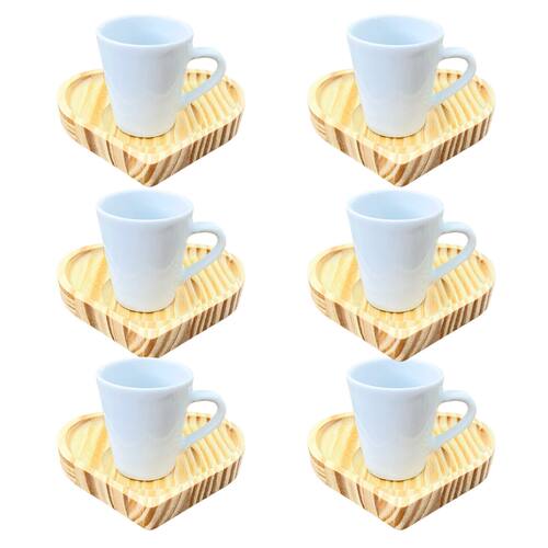 Jogo 6 xícaras café expresso 55ml Porcelana c/ pires coração Peças de porcelana feitas de material de alta qualidade, queimados em alta temperatura, o que os torna fortes, resistentes e com alto brilho, e deixa qualquer ambiente mais bonito e moderno. Nova tendência, mistura de porcelana com madeira, charmosa e moderna para servir em xícaras para todos de sua casa e receber as visitas e amigos. A porcelana tem uma enorme vantagem sobre outros materiais, pois é fácil de limpar e não absorve cheiro, o que deixa a peça e o ambiente livre de mal cheiro. Ótimas tambem para padarias, cafeterias, buffetts e restaurantes São resistentes ao forno, micro-ondas e lava-louças. Cor Branca Capacidade 55ml OBS: Por se tratar de madeira de pinus natural, entre os pires podem existir pequenas variações na tonalidade das cores da madeira. Pode haver variação de tonalidade entre as peças de porcelana devido a diferentes lotes de queima. Embalagem contêm 12 peças (6 xícaras e 6 pires) Marca: Antilope Decor Porcelanas