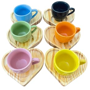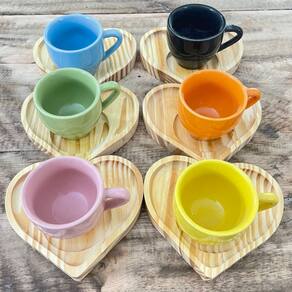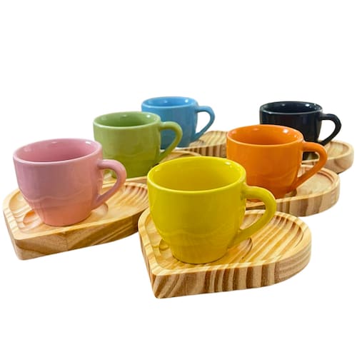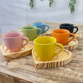 Jogo 6 xícaras café expresso 75ml Porcelana c/ pires coração Peças de porcelana feitas de material de alta qualidade, queimados em alta temperatura, o que os torna fortes, resistentes e com alto brilho, e deixa qualquer ambiente mais bonito e moderno. Nova tendência, mistura de porcelana com madeira, charmosa e moderna para servir em xícaras para todos de sua casa e receber as visitas e amigos. A porcelana tem uma enorme vantagem sobre outros materiais, pois é fácil de limpar e não absorve cheiro, o que deixa a peça e o ambiente livre de mal cheiro. Pires de pinus bem moderno com formato que facilita o ato de servir Ótimas tambem para padarias, cafeterias, buffetts e restaurantes São resistentes ao forno, micro-ondas e lava-louças. Cor Multicolorida Capacidade 75ml OBS: Por se tratar de madeira de pinus natural, entre os pires podem existir pequenas variações na tonalidade das cores da madeira. Pode haver variação de tonalidade entre as peças de porcelana devido a diferentes lotes de queima. Embalagem contêm 12 peças (6 xícaras e 6 pires) Marca: Antilope Decor Porcelanas