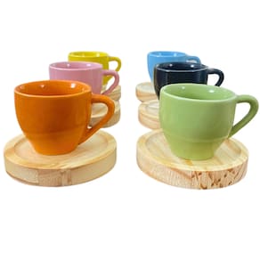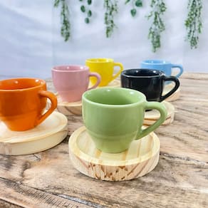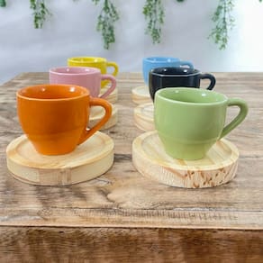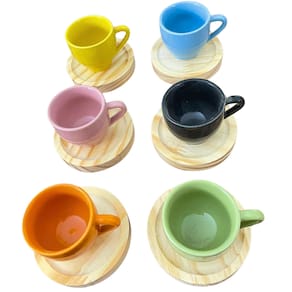 Jogo 6 xícaras café expresso 75ml Porcelana c/ pires redondo Peças de porcelana feitas de material de alta qualidade, queimados em alta temperatura, o que os torna fortes, resistentes e com alto brilho, e deixa qualquer ambiente mais bonito e moderno. Nova tendência, mistura de porcelana com madeira, charmosa e moderna para servir em xícaras para todos de sua casa e receber as visitas e amigos. A porcelana tem uma enorme vantagem sobre outros materiais, pois é fácil de limpar e não absorve cheiro, o que deixa a peça e o ambiente livre de mal cheiro. Pires de pinus bem moderno com formato que facilita o ato de servir Ótimas tambem para padarias, cafeterias, buffetts e restaurantes São resistentes ao forno, micro-ondas e lava-louças. Cor Multicolorida Capacidade 75ml OBS: Por se tratar de madeira de pinus natural, entre os pires podem existir pequenas variações na tonalidade das cores da madeira. Pode haver variação de tonalidade entre as peças de porcelana devido a diferentes lotes de queima. Embalagem contêm 12 peças (6 xícaras e 6 pires) Marca: Antilope Decor Porcelanas